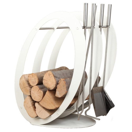 Nowoczesny zestaw akcesoriów kominkowych ze stojakiem na drewno w kolorze białym