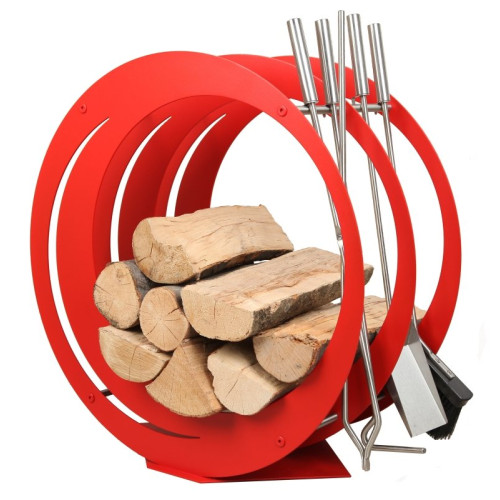 Nowoczesny zestaw akcesoriów kominkowych ze stojakiem na drewno w kolorze czerwonym