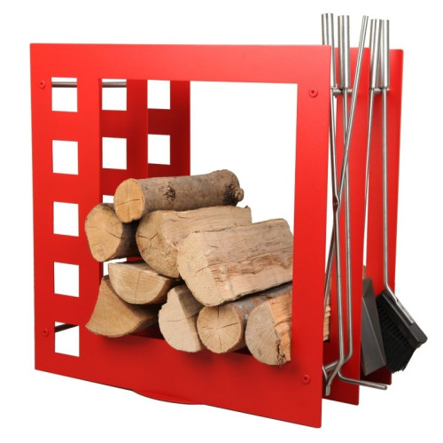 Nowoczesny zestaw akcesoriów kominkowych ze stojakiem na drewno w kolorze czerwonym